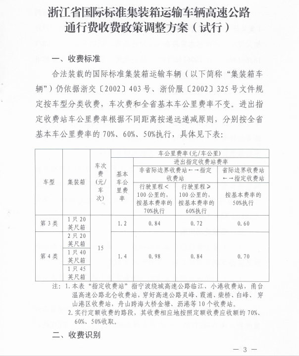 浙江省國際標準集裝箱運輸車輛高速公路通行費收費政策調整方案(試行)