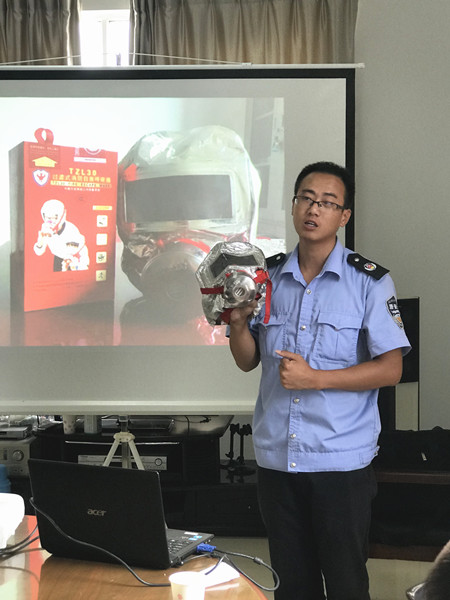 圖為臺州居安防火中心陳教員在講解消防器具使用方法