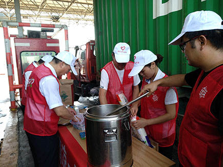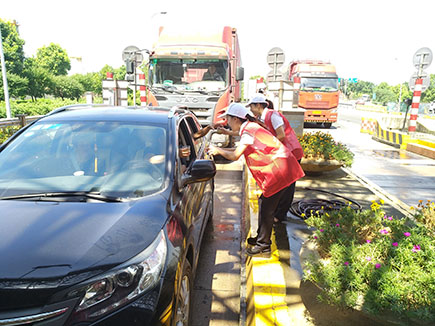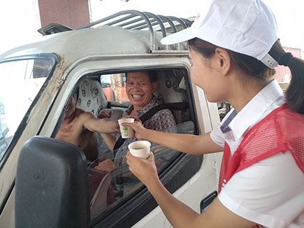 志愿者們兵分三路,一路在外廣場對滯留車輛進行文明勸導,一路拿著垃圾袋和撿拾工具沿收費區域收集垃圾,另一路則在安全島上向過往的司乘人員宣傳夏日行車安全知識,同時提供礦泉水、冰鎮綠豆湯,發放清涼油、風油精等防暑降溫用品,不僅為司乘人員提供熱情周到的服務,還讓過往司乘人員在炎炎夏日真切感受到一絲清涼和一份關心。