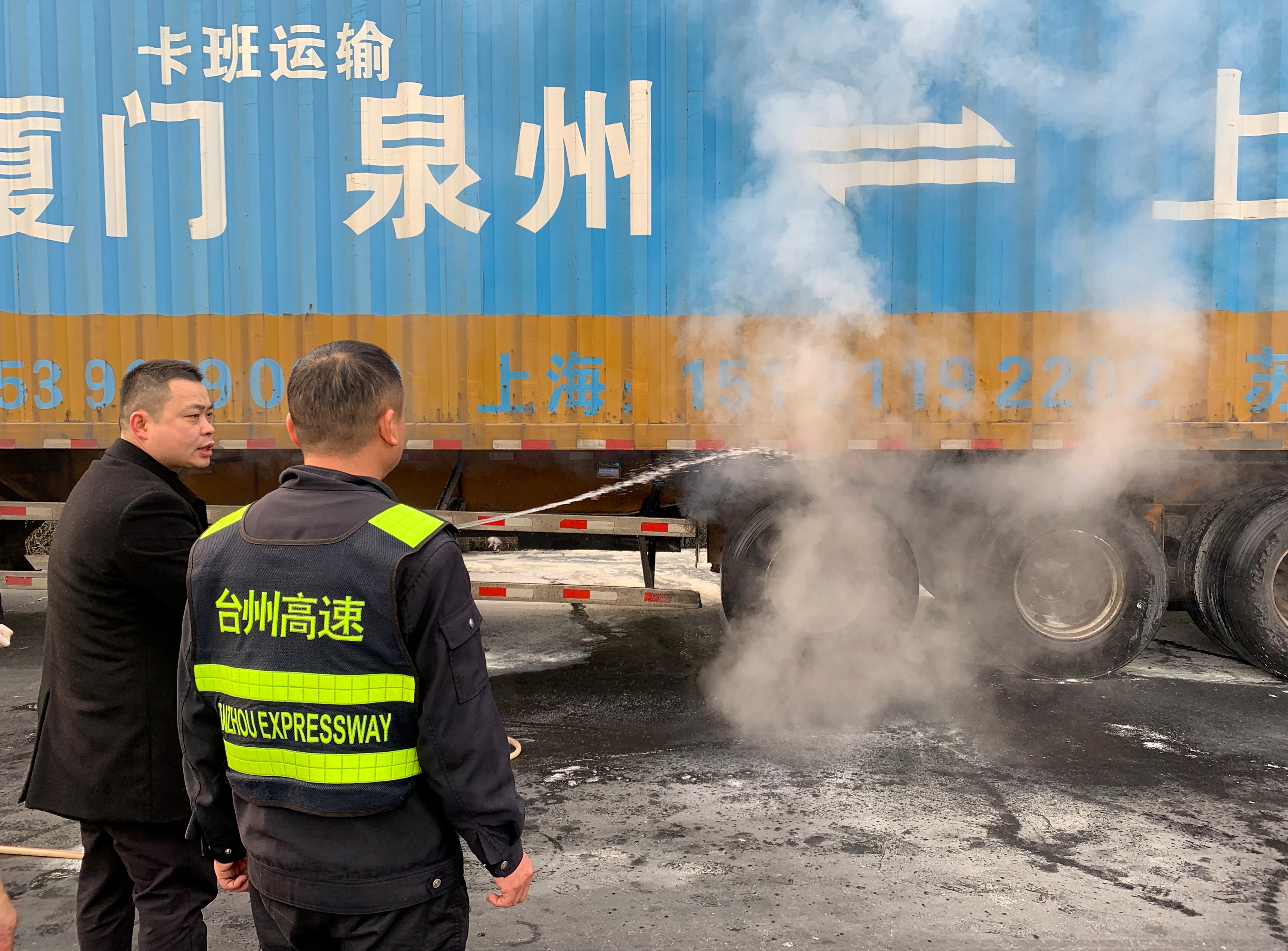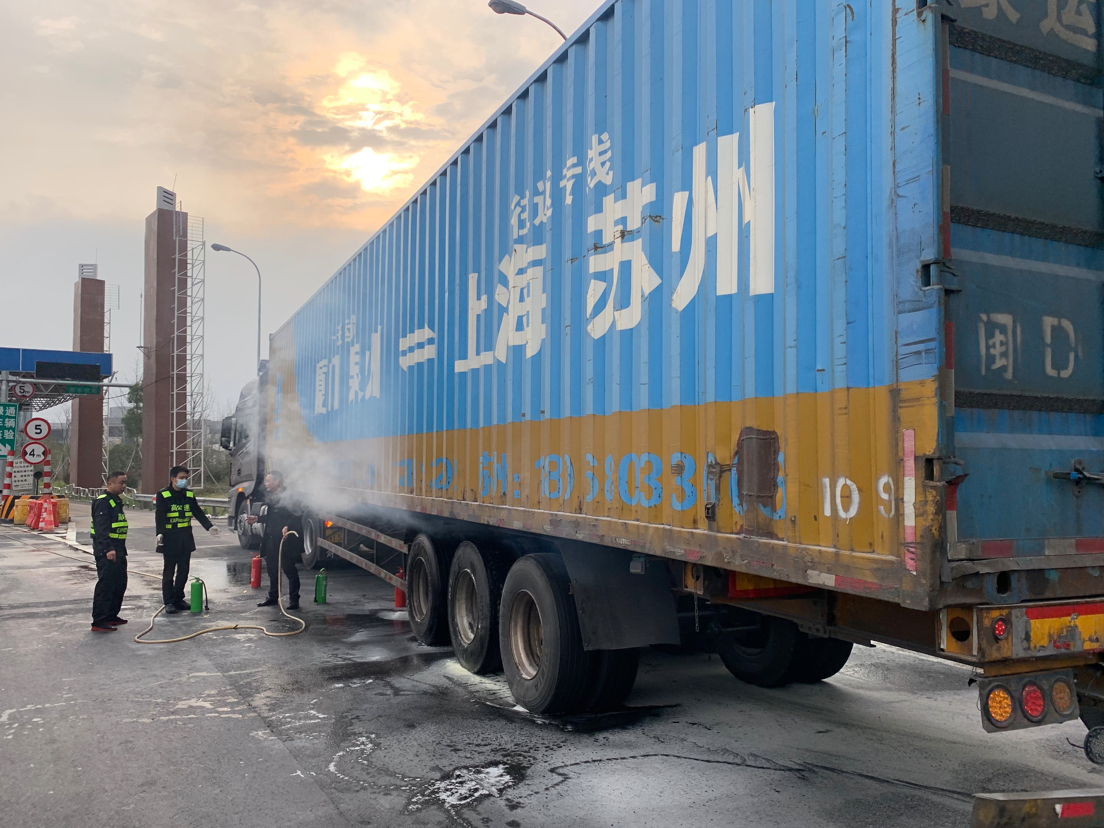 “嘭……”3月5日早上7:35分左右,臺州收費所傳來一聲巨響,一輛車牌“閩”字開頭的大貨車緩緩駛來,其車廂后輪胎正冒火光,隨之白煙滾滾升起,駕駛員卻渾然不知,一路行駛。
