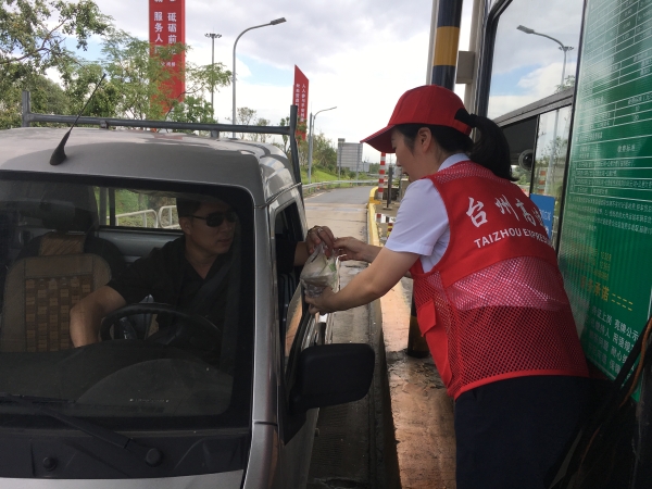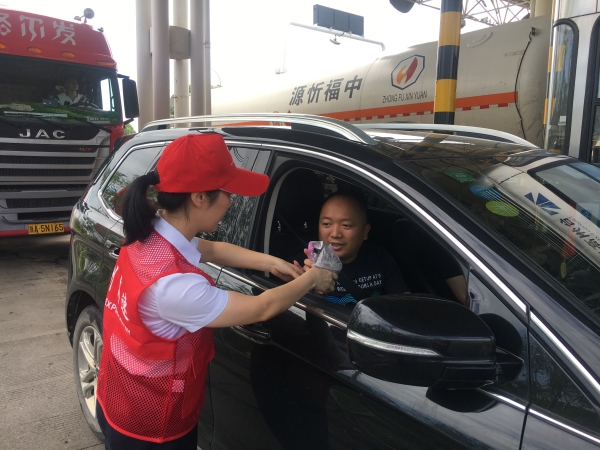 圖為志愿者們正在向過往司乘人員派發消暑飲品