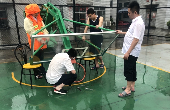 此前,溫嶺西已經(jīng)做好基礎的抗臺防范工作,關閉所內(nèi)各寢室、辦公室門窗,提前裝好沙袋備用,準備好抗臺物資及近幾天的餐食,確保所內(nèi)各項事務正常運行。8月9日上午,該所長、副所長在臺風前做最后一次細致的排查,三人還親自動手將陽光房的窗戶都卸下來,避免風力太大,玻璃破裂,造成安全隱患。此外,為預防操場籃球架承受不住巨大風力,將籃球框拆卸下來,把籃球架放倒。其后通知所內(nèi)開車的人員將所有車輛停入操場中,以防止周邊樹木被風刮斷,造成車輛損失。