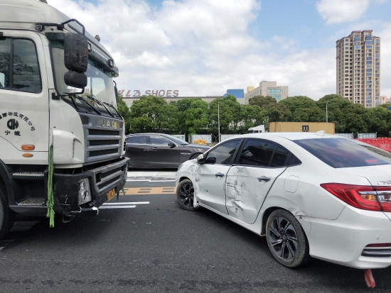 4月1日12點(diǎn)16分,在溫嶺西高速公路收費(fèi)站出口,突然一聲巨響,大貨車(chē)司機(jī)緊急剎車(chē),輪胎與地面劇烈摩擦。一輛車(chē)牌為浙B的集裝箱與一輛車(chē)牌為浙C的小轎車(chē)相撞,小轎車(chē)的車(chē)門(mén)瞬間被撞得凹凸不平,且整個(gè)車(chē)身橫在集裝箱車(chē)頭前面,現(xiàn)場(chǎng)看起來(lái)似乎是小轎車(chē)司機(jī)掉頭“變道”導(dǎo)致兩車(chē)相互“親吻”。