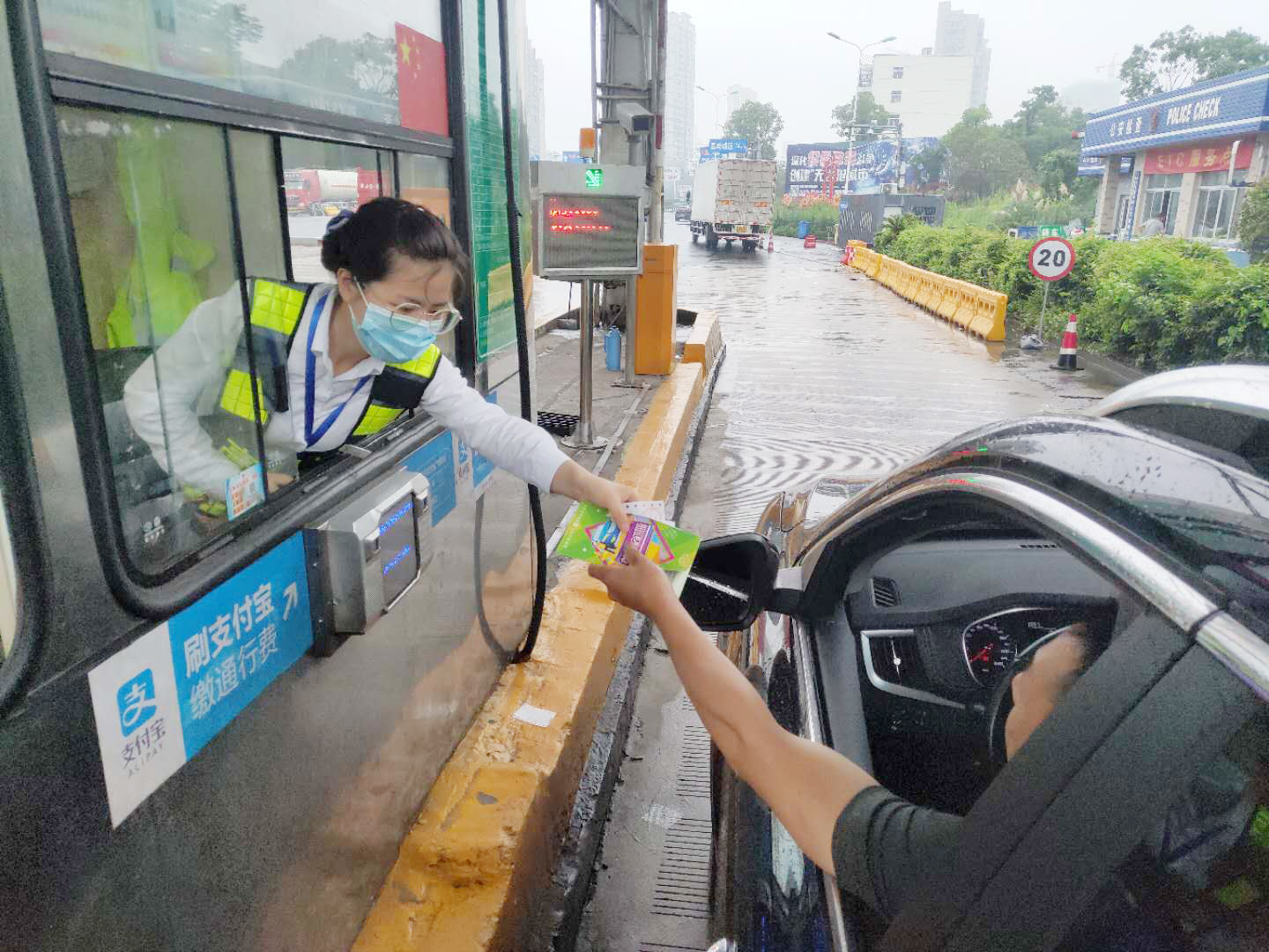 圖為收費員向過往司乘發放宣傳單