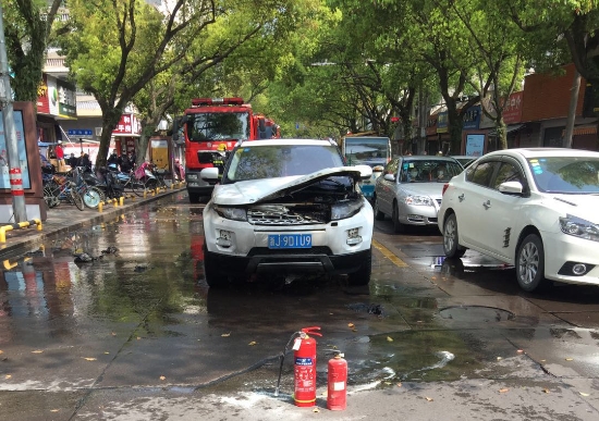 金素彬店里剛好一個滅火器,二話沒說,第一時間沖到現場,迅速搬出滅火器參與滅火在大家齊心合力下有效減小了火勢,抑制了火情進一步擴大。隨后,消防車迅速趕到,在消防官兵的奮力撲救下,大火被撲滅。由于滅火及時,路虎車沒有造成更大的財產損失。