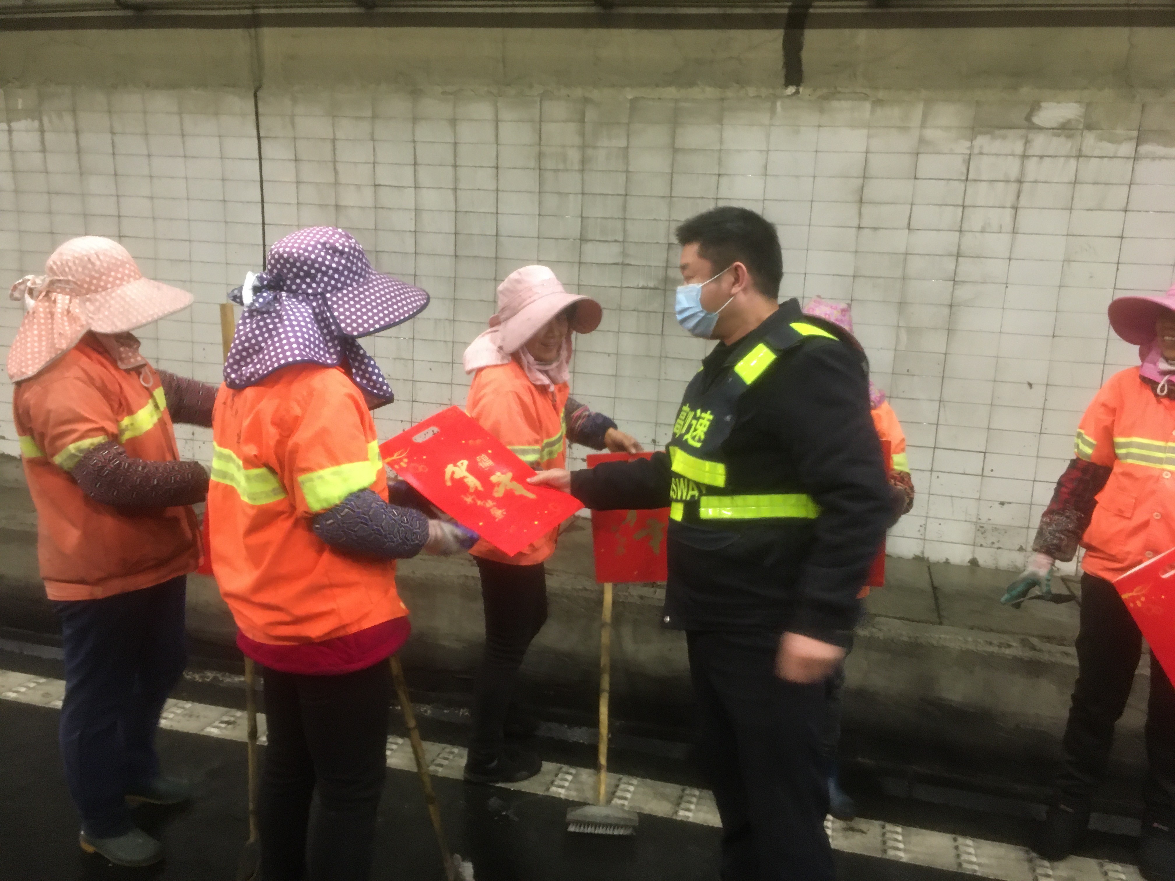 上午十點(diǎn)左右,盧所把工人們迎到食堂,熱情的招呼著大家。當(dāng)班的隊(duì)員們把一碗碗熱乎乎的臘八粥送到養(yǎng)護(hù)工人們的手中,吃著這冬日里的熱粥他們臉上露出了由衷的笑容。 下午,從公司匆匆趕回來的應(yīng)所帶領(lǐng)隊(duì)員們對(duì)隧道的清洗情況進(jìn)行了驗(yàn)收,肯定了養(yǎng)護(hù)工人們的勞動(dòng)成果,并表示了親切的慰問,同時(shí)把一幅幅春聯(lián)親自送到了他們的手中。