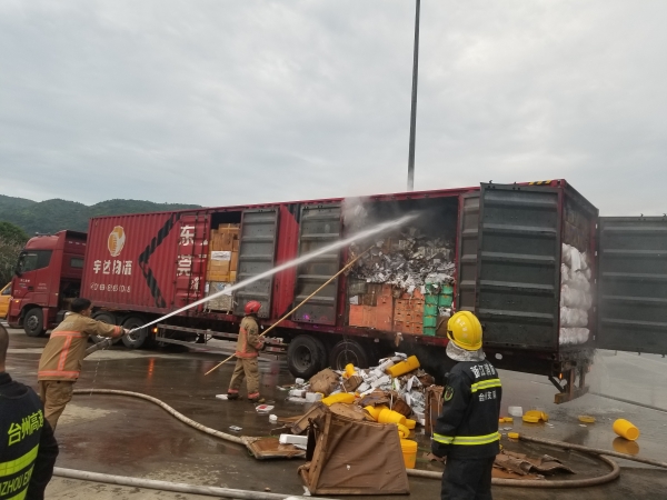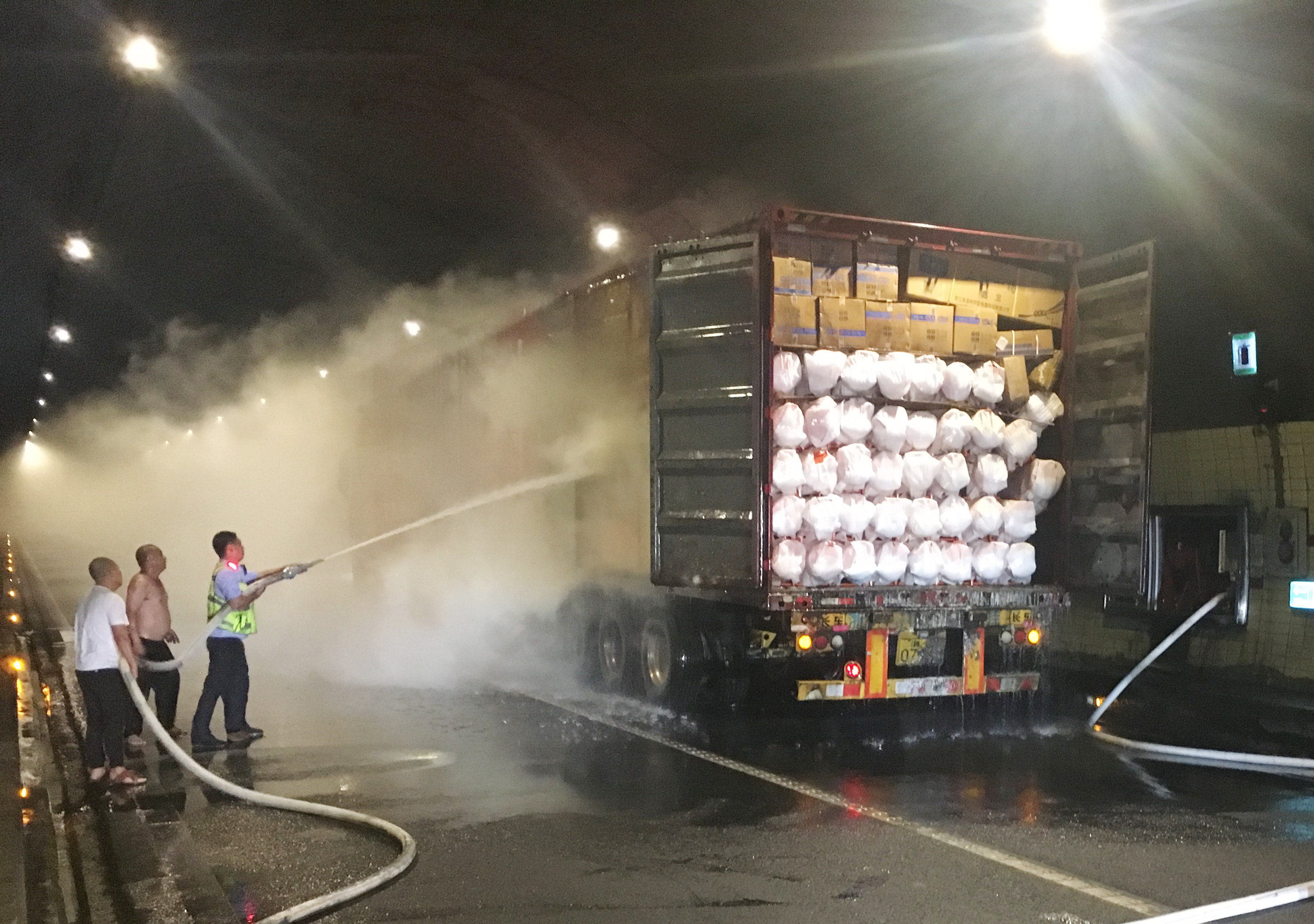 萬幸的是,恰逢溫州高速交警巡邏車經過,隨即在該貨車后方預警,很快的所巡邏車消防車先后到達現場協同滅火。由于該車貨物多,且裝載物皆為紙箱和塑料,集裝箱底層溫度較高,一時只能將明火撲滅,但車廂內仍有大量煙霧,為了安全,車子必須盡快撤離隧道,執勤隊當即決定讓駕駛員把車開往南廣場繼續滅火,消防車則一路隨其后滅火,以防火勢變大。
