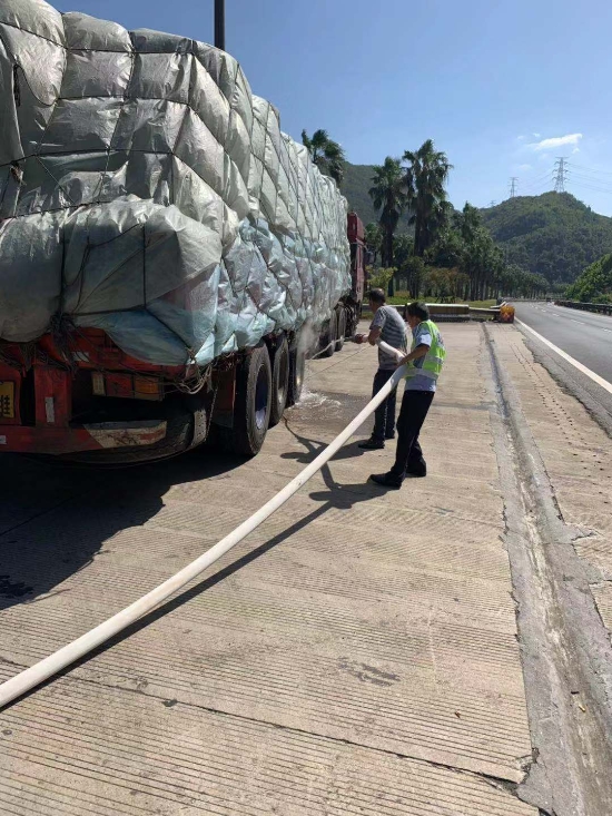 同時,中控員密切關注車輛動向,13:37,中控員在隧道南廣場發現該車,巡邏車立即奔赴現場,該車后輪胎剎車位置在冒煙,司機正用礦泉水澆輪胎,隊員們見狀,火速上前把消防栓打開,接上消防水帶,交與該車司機,托著消防水帶,對準輪胎接連猛射,冷卻剎車片,輪胎終于沒有冒煙,一場隱患被隊員消除了。