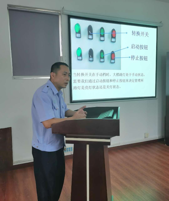 湯寧光在電工崗位已經19載,有著豐富的工作經驗。他用聊家常的方式來講解線路控制的工作原理圖、電路的故障排除方法、光控開關的接線方法,PPT課件中配隧道所配電房中相應的照片和線路圖并注解,簡潔明了,通俗易懂。在授課過程中,他每講到一處結尾,便與聽課人員互動,現場為大答疑解惑,課堂氛圍熱烈互動感很強
