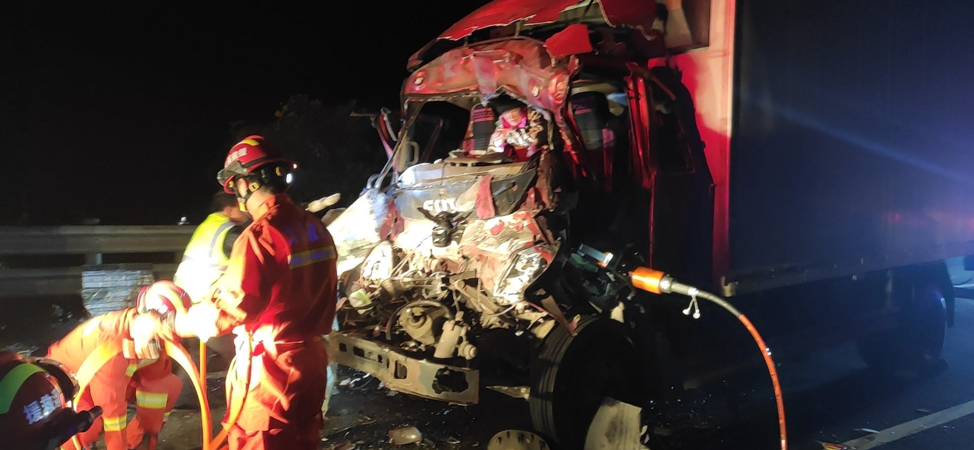 21:50巡邏車和消防車同時到達現場,隊員陳幸飛快的跑下來,以百米沖刺的速度做好巡邏車的安全措施和預警工作,有3人受傷,事故車頭已嚴重變形,一名女性腰部受傷坐在地上,語速正常,思維清晰。還有二名人員被卡在駕駛室,消防隊員正在查看現場準備施救,受傷人員哭爹喊娘嚎聲不斷,由于救護車還沒達到現場,陳幸在事故車后方硬路肩上維護秩序,防止車輛占道,并同時迎接救護車,湯寧光則在維護現場秩序,阻止其他司機圍觀影響救援。