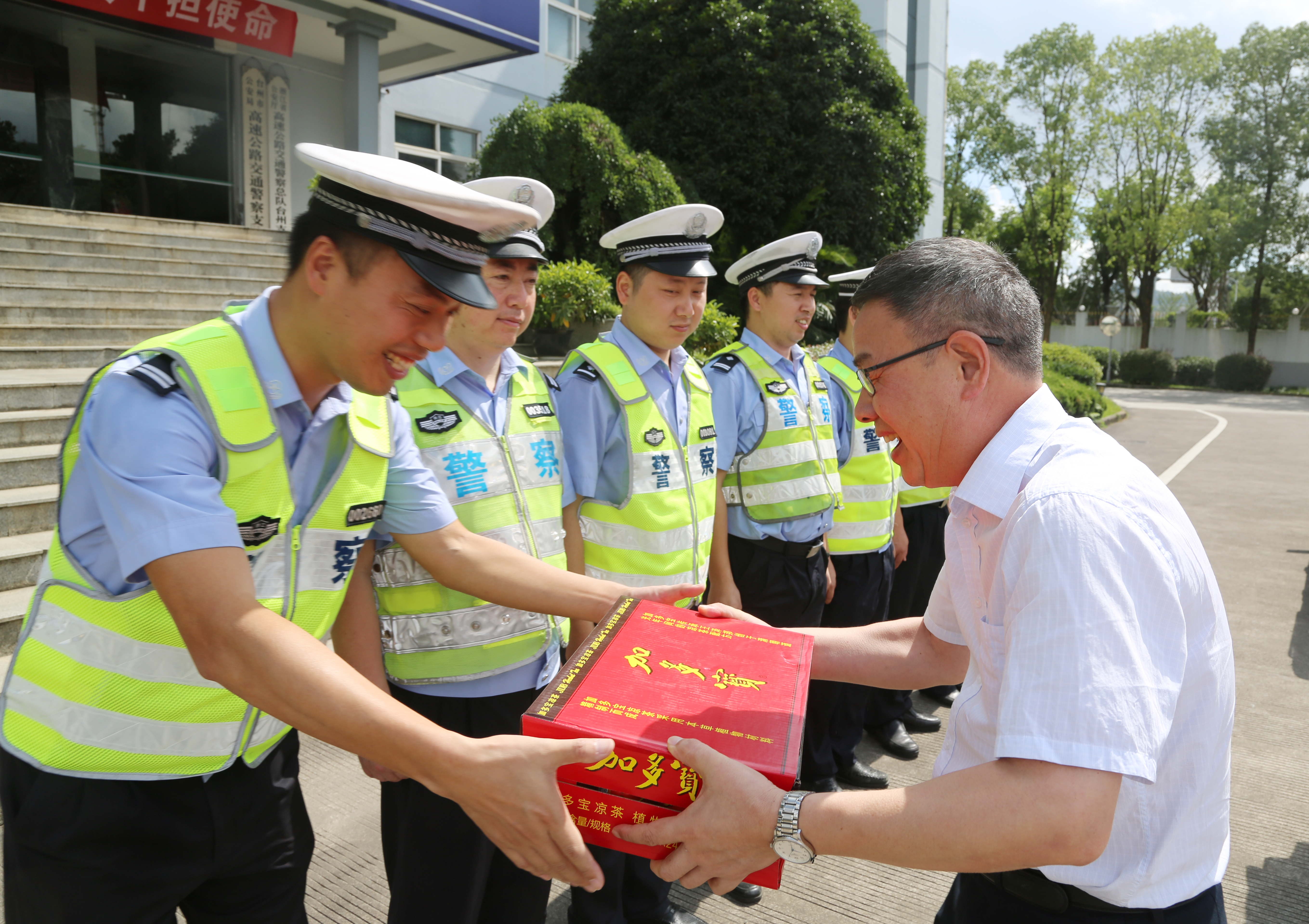 陳文波一行首先來到臺(tái)州高速公路交警總隊(duì)臺(tái)州支隊(duì)和高速路政的駐地,向他們送上了消暑物資,對(duì)他們一直以來有力維護(hù)高速公路秩序,保障本路段有序運(yùn)營(yíng)及高溫下堅(jiān)守一線工作表示慰問和感謝,也請(qǐng)他們繼續(xù)支持公司工作,確保高速公路安全暢通。