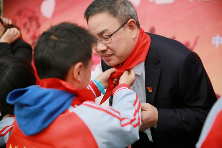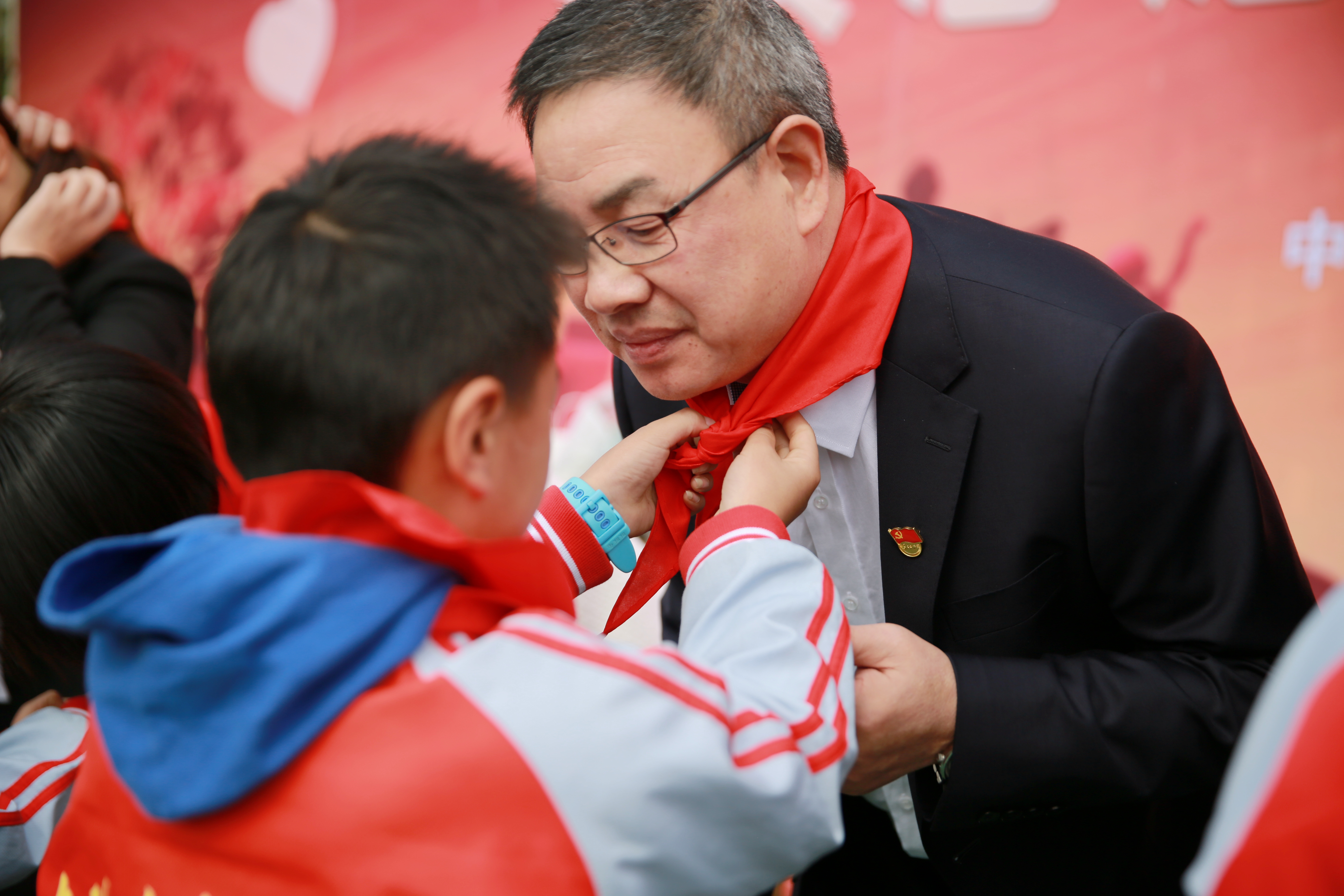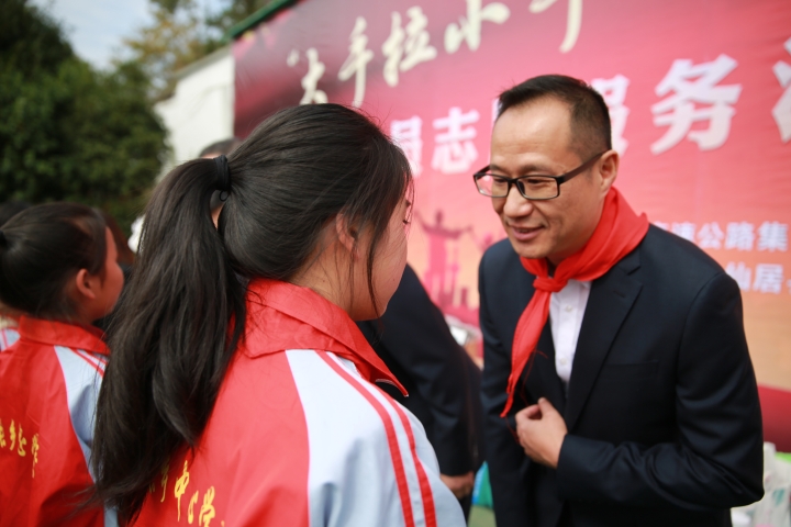 “點亮微心愿”環節,臺州高速集團領導班子們為學生代表送上新衣服、學習用品等,孩子們則為志愿者叔叔阿姨們系上了在他們眼中最珍貴的紅領巾。