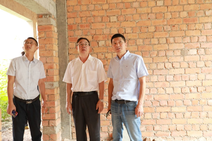 圖為陳文波一行在淡竹景區查看茅草山莊外立面建設情況