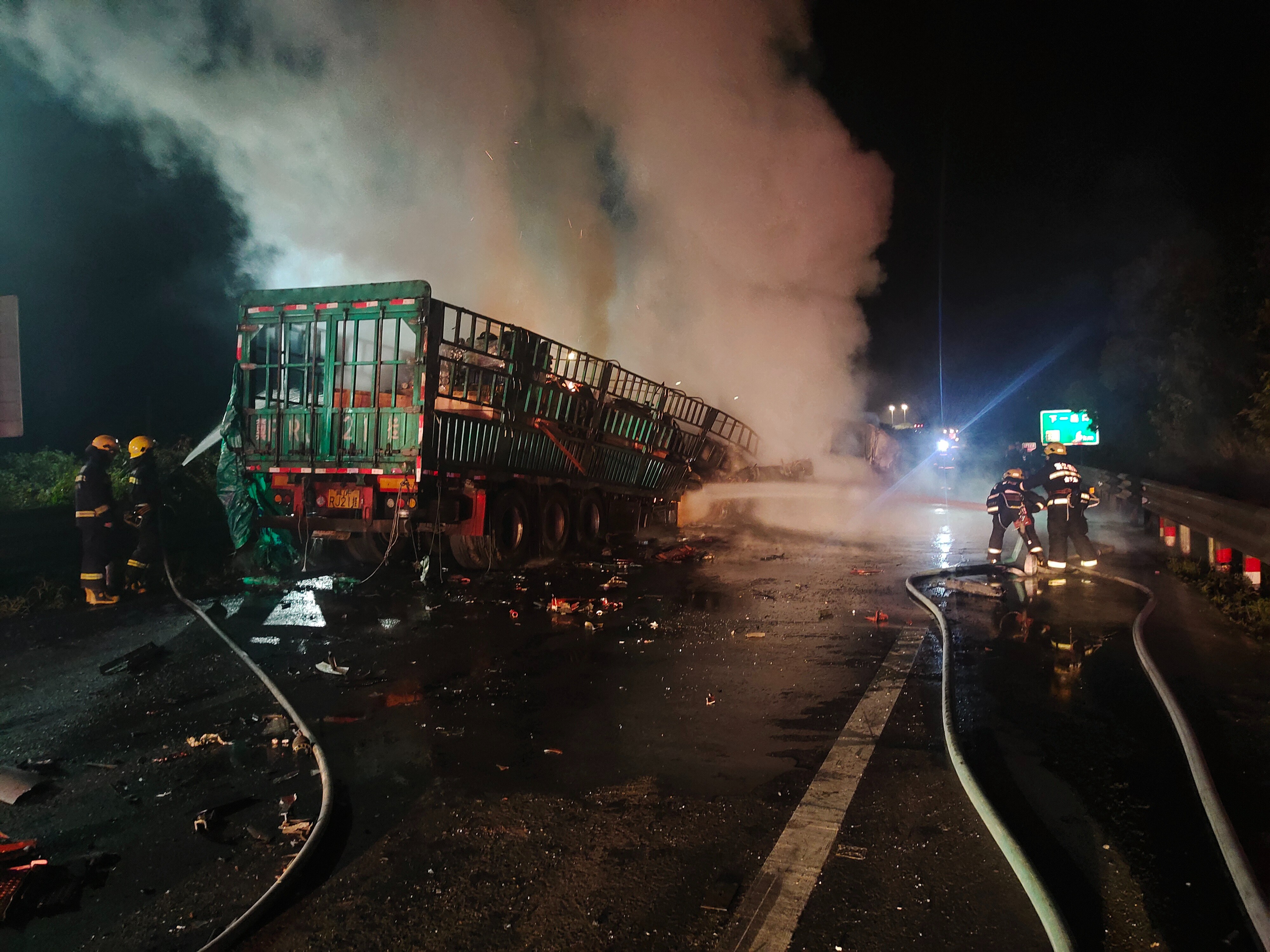 4月21日凌晨2點,G15沈海高速甬臺溫段寧波方向距離黃土嶺隧道不到2公里的地方,有一輛半掛車與前車發生追尾事故,隨后起火燃燒。
