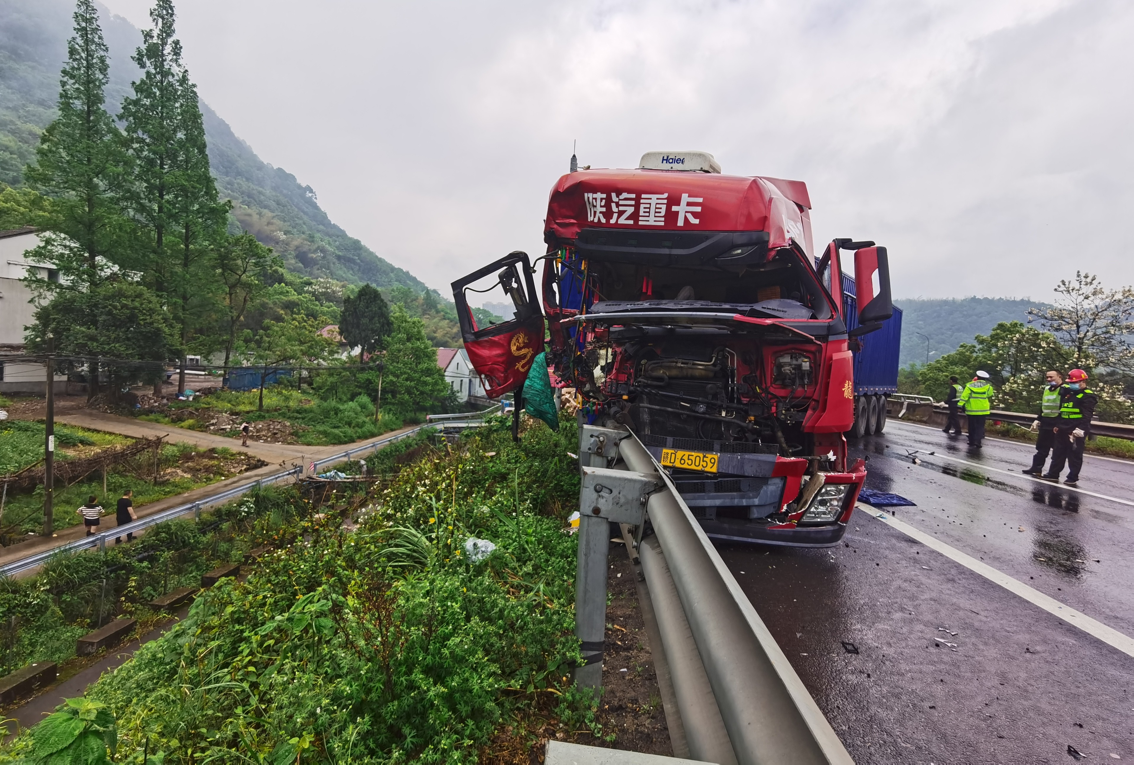 寧向洞口200米處,有一輛14米長(zhǎng)的箱式大貨車避讓不及撞上了一輛平板小貨車,隨即又撞到隔離護(hù)欄,整個(gè)車頭瞬間被撞得七零八碎嚴(yán)重變形,車尾橫向路面且僅留小車能駕駛的空間。被追尾平板貨車所載貨品散落一地,高速路上護(hù)欄外一片狼藉,所幸無(wú)人員傷亡,大貨車司機(jī)膝蓋輕微傷。