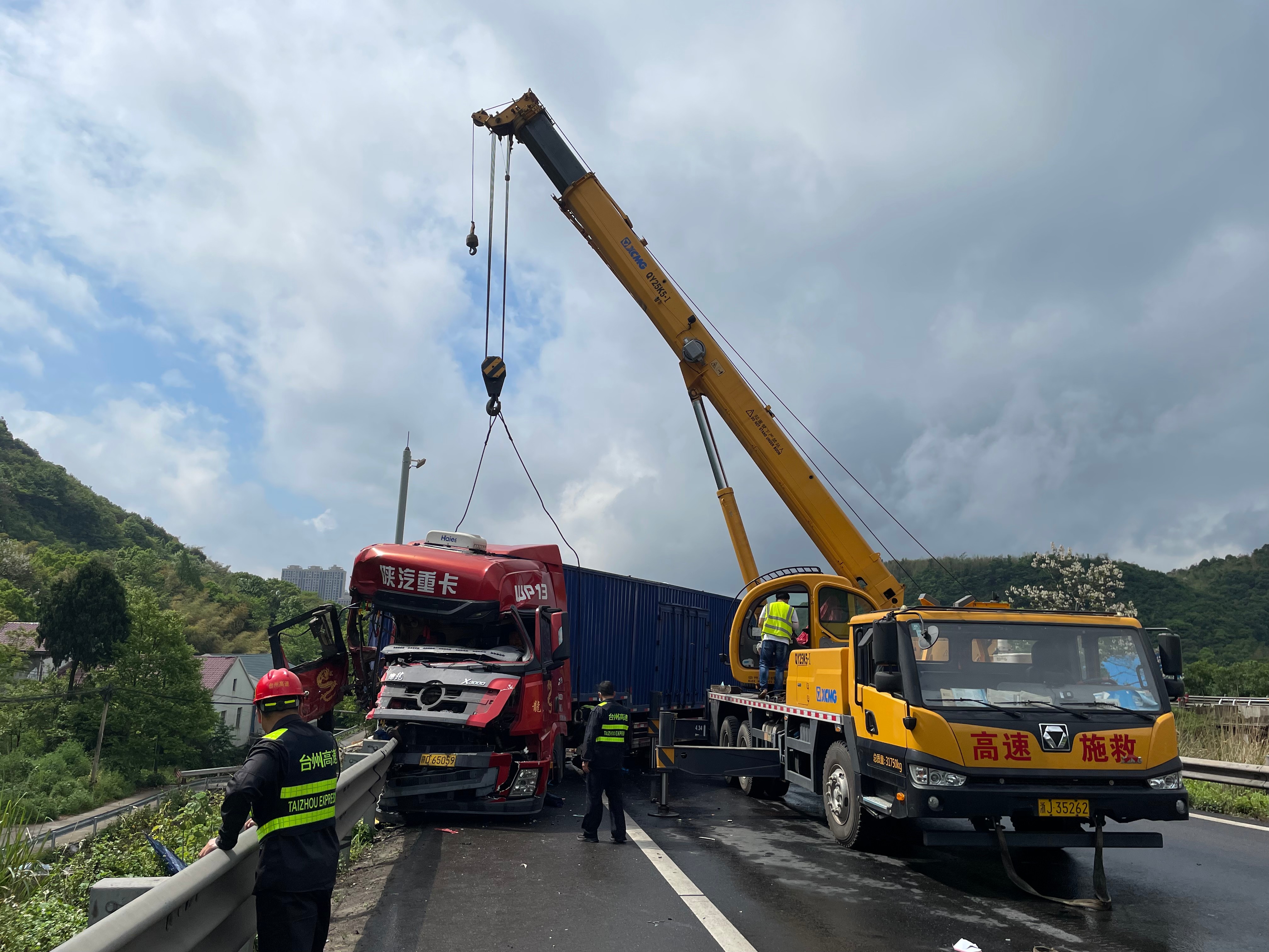 隨后,拖車救護(hù)車吊車相繼到達(dá),所有人員立即有序分工,因大貨車車頭卡在護(hù)欄,需要切割,拖車難度較大需要吊車將其拖出,現(xiàn)場(chǎng)救援緊急開展隧道所工作人員協(xié)助駁貨車清理貨物和散落車架,保證高速路面通暢。