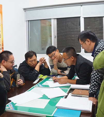圖為深夜參加施工討論會