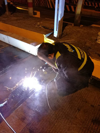 到了現場,隊員發現該車道輪檢器鐵板螺孔由于不斷摩擦并逐漸變大,導致整顆螺栓脫離底下固定螺座,加之當天是春節高速免費第一天,車輛經過時車速都較快,直接將整塊鐵板帶離底座。如果不及時對鐵板進行加工恢復,不僅不能保護下面的輪檢器,而且還有可能造成車輛爆胎。可除夕夜全部加工廠都已關門,如果讓廠家發貨至少也要好幾天。正在兩難之際,中心副經理葉俊想到將鐵板與底座邊緣直接焊死的臨時應急方法,待節后再向廠家定制或重新購買。 方案有了,大家兵分兩組,一組去中心倉庫拿電焊機、電焊條等設備,一組待在原地清理鐵底下方於泥等雜物,為隨后的電焊工作做準備。設備到位后,葉俊一手操起電焊罩,一手熟練的將電焊條點在了鐵板與底座邊緣之間,經過近一個小時的處理,輪檢鐵板與地面底座牢牢地固定在一起,再也不用被飛馳而過的車輛帶離。 項寅曉
