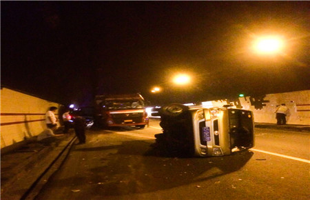 這輛“始作俑者”的車輛由于司機疲勞駕駛,不慎撞擊隧道壁而引發側翻,雖然該車內無人員受傷,可是跟隨其后的拖掛車就沒那么幸運。拖掛車司機看到前方出狀況,當即采取緊急制動,剎得太急又致使后方小貨車追尾,導致該車車頭嚴重受損,司機的手臂受了傷,運輸的鋁塊也撒了一地。