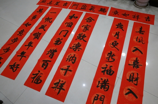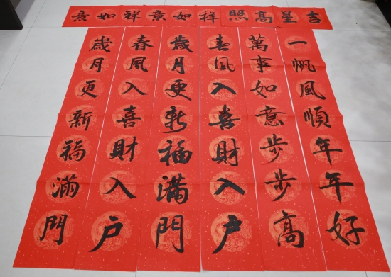 圖為學(xué)員學(xué)習(xí)寫書法 本次活動(dòng)由集團(tuán)辦公室牽頭組織,以集中書寫和分開書寫相結(jié)合的方式進(jìn)行。參與者在百忙之中抽出自己的業(yè)余時(shí)間,積極參與到活動(dòng)中來,共同書寫500多幅春聯(lián)作品。春節(jié)臨近,集團(tuán)全體員工和集團(tuán)兩個(gè)結(jié)對(duì)村的100戶村民都將收到暖暖的“送春聯(lián)”祝福。 當(dāng)日集中書寫現(xiàn)場(chǎng),參與者們認(rèn)真埋頭書寫,并不時(shí)地相互請(qǐng)教學(xué)習(xí)。有的下筆蒼勁有力、筆精墨妙,有的如行云流水一筆而下,有的力透紙背,一個(gè)個(gè)大字很快躍然紙上。