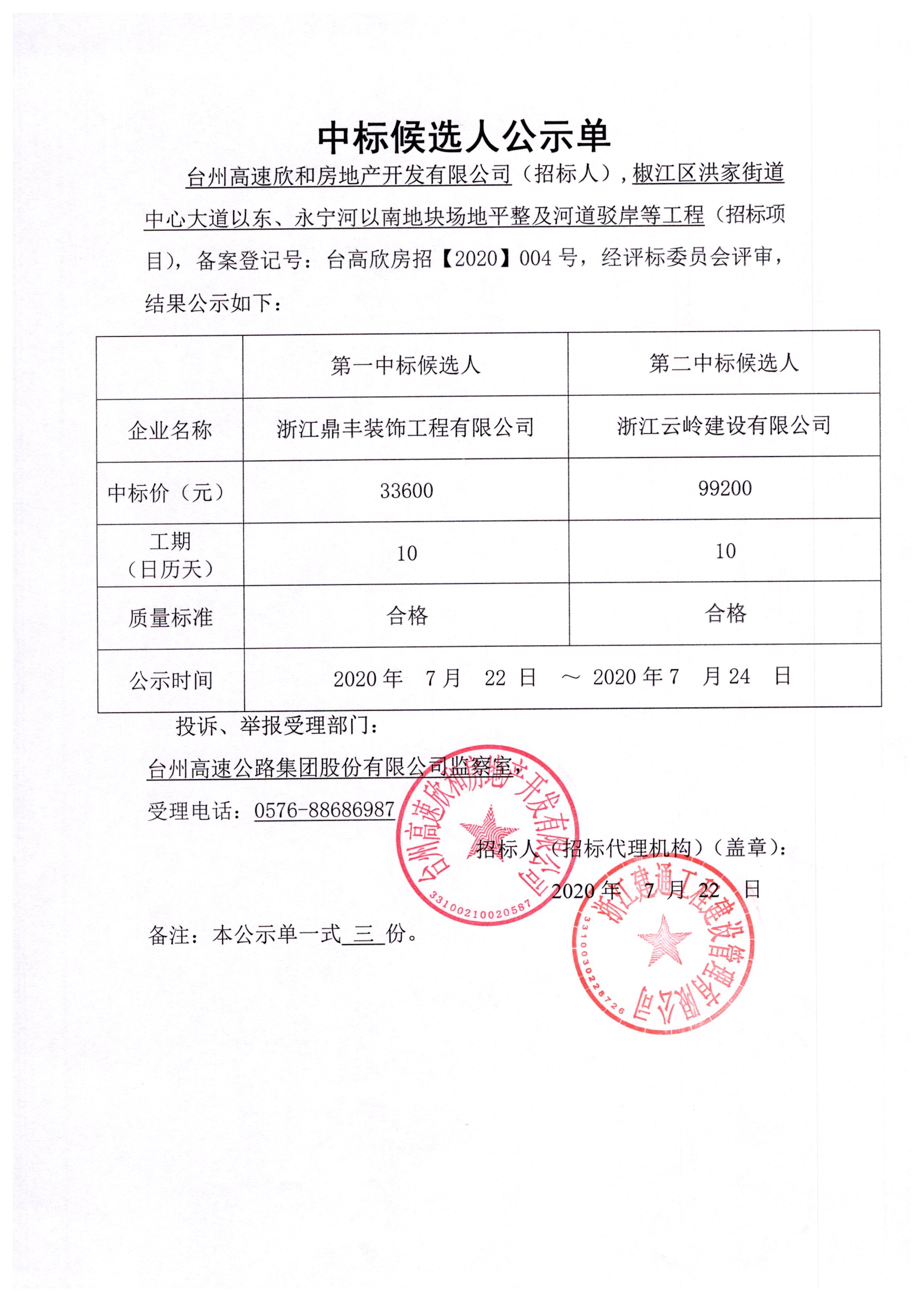 椒江區(qū)洪家街道中心大道以東、永寧河以南地塊場地平整及河道駁岸等工程(招標項目)中標候選人公示單