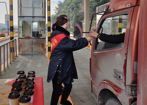 活動當(dāng)天,雖然氣溫較低,但是在臨海南收費(fèi)所入口處,身著紅色綬的志愿者們依然熱情地為過往司乘人員遞一杯杯滾燙的姜茶,并過往大貨駕駛員發(fā)放優(yōu)惠政策宣傳單。
