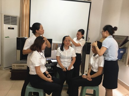 在老師的理論講解和親手示范下,在場人員分成兩組,現學現練,一組人用所學手法演示操作,另一組人坐著感受,老師在旁一一指點不足之處,然后兩組人員互換,交替學習。